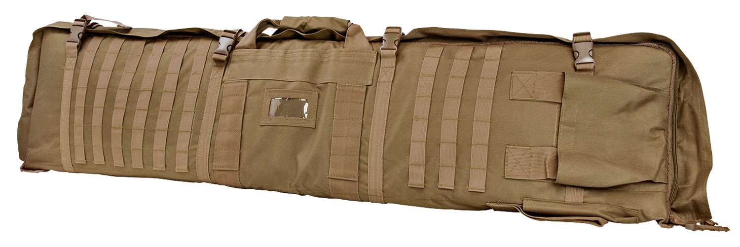 This rifle case/shooting mat has thick pads that protects you gun while transporting to the range. It also features heavy duty zippers, adjustable compression straps with quick connect plastic buckles, wrap around carry handle straps and Molle webbing sewn to one side to attach other Molle compatible gear to the case. Main compartment: 48" L X 11" H X 1.75" D. Rifle Case unfolds into a 66" L X 35" w/Shooters Mat.