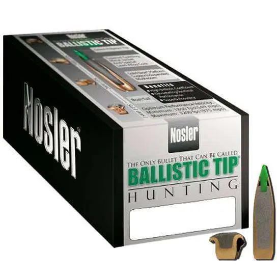 Nosler engineered the Ballistic Tip Hunting bullet to be very predictable and extremely forgiving. The polymer tip resists deformation in the magazine, initiates expansion upon impact and is color-coded by caliber. The fully tapered jacket and special lead alloy core allows controlled expansion and optimum weight retention at all practical velocity levels. A heavy jacket base prevents bullet deformation during firing and acts as a platform for large diameter mushroom. Nosler's unique solid base boat-tail design, combined with the polycarbonate tip, dramatically increases long-range ballistic efficiency.