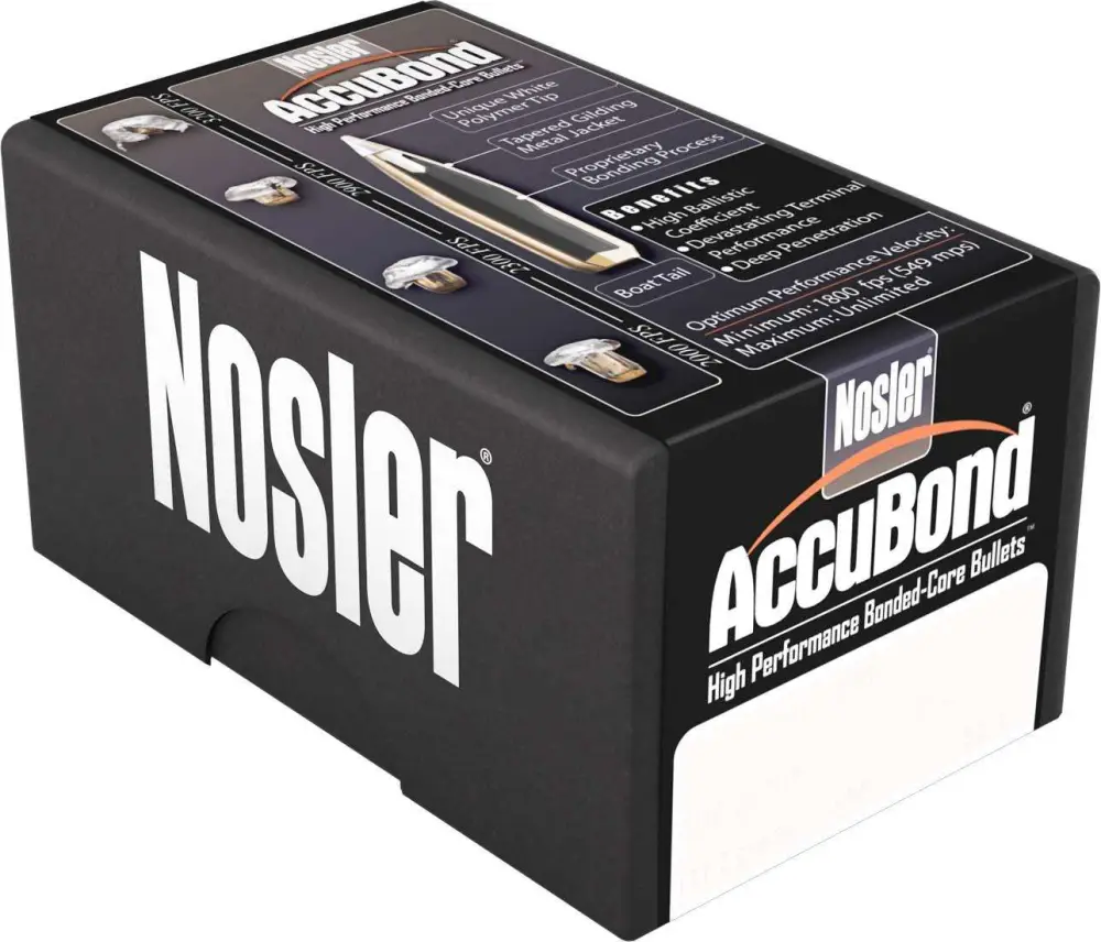 AccuBond is designed to be a highly-accurate big game hunting bullet suitable for use on a wide variety of game. Its bonding process eliminates voids in the bullet core, and AccuBond marries Nosler's traditional copper-alloy jacket with its special lead-alloy core. The result is a bullet that flies true, penetrates deep and retains its weight and won't cause extensive barrel fouling. The unique white polymer tip resists deforming and initiates expansion on impact. Nosler's Solid Base at the rear of the bullet acts as a platform for large diameter mushrooms. Boat tail configuration combines with the streamlined polymer tip for long-range performance and for easier loading.