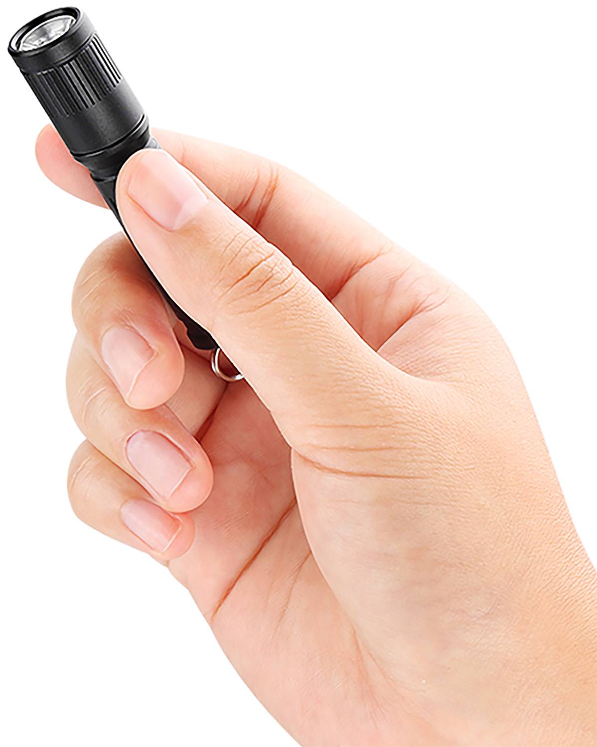 A simple head twist to activate the i3E EOS keychain flashlight with 90 lumens with machining for optimal grip. Powered by a single widely available AAA battery. Features a high-performance Philips LUXEON TX LED and a PMMA TIR lens that focuses the light to reach out up to 44 meters.