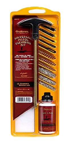 Universal Pistol Cleaning Kit includes a brass cleaning rod; phosphor bronze bore brush; wool blend mop; slotted patch loop; spear pointed jag; micro-fiber absorbent patches; Nitro Solvent Gun Cleaner 2oz bottle and Gun Oil 2oz bottle. Comes in a reusable clamshell for storage.