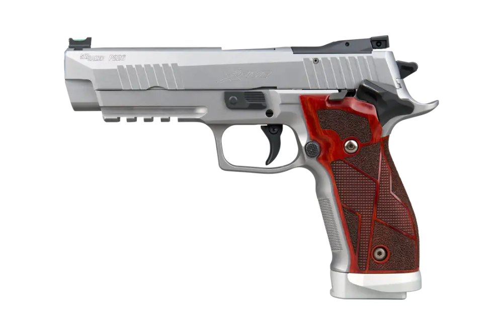 The P226 9MM 5IN X-FIVE in stainless finish with SAO controls and wood grips is a custom works handgun package built with a 5-inch barrel and a steel magazine set. The configuration includes (3) 10-round steel magazines and a magwell for faster reload handling.