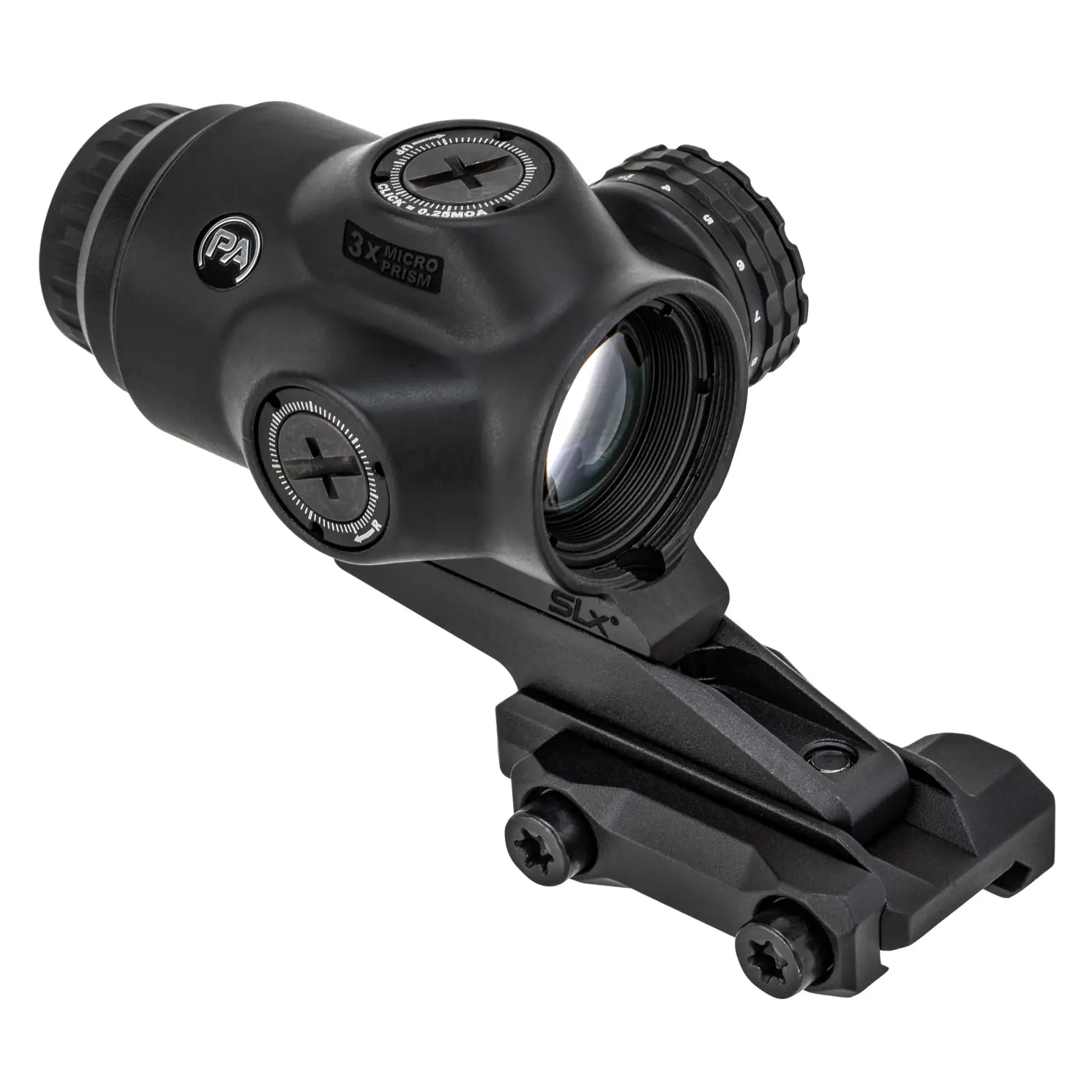 This Primary Arms MicroPrism is part of the SLx optics line. SLx optics built their reputation for innovation, reliability, and value. All SLx optics undergo rigorous field-testing during development to best serve you in any environment. The SLx 3x MicroPrism is an all-new advanced optical system that combines the compact, lightweight size of a microdot with the durability and precision of a 3x magnified optic. The SLx 3x MicroPrism offers 13 illumination settings with AutoLive motion-sensing on/off technology and multiple night vision compatibility options. Weighing under 8oz, the SLx 3x MicroPrism is smaller and lighter than many red dot sights, though its crystal-clear glass and 3x magnification offer improved precision at distance. Even in close-quarters, the optic's wide field-of-view and forgiving eye relief make it easy to snap on target. Because the SLx 3x MicroPrism uses an etched reticle with adjustable diopter, the user will always have a clear, crisp reticle image, even if they have severe astigmatism. When set to max illumination, the MicroPrism reticle is fully daylight bright. For low-light, this optic offers 3 different NV-compatible settings, accommodating any ambient light level. Paired with the AutoLive motion-sensing illumination technology, this optic provides an exceptionally long runtime at any brightness setting.