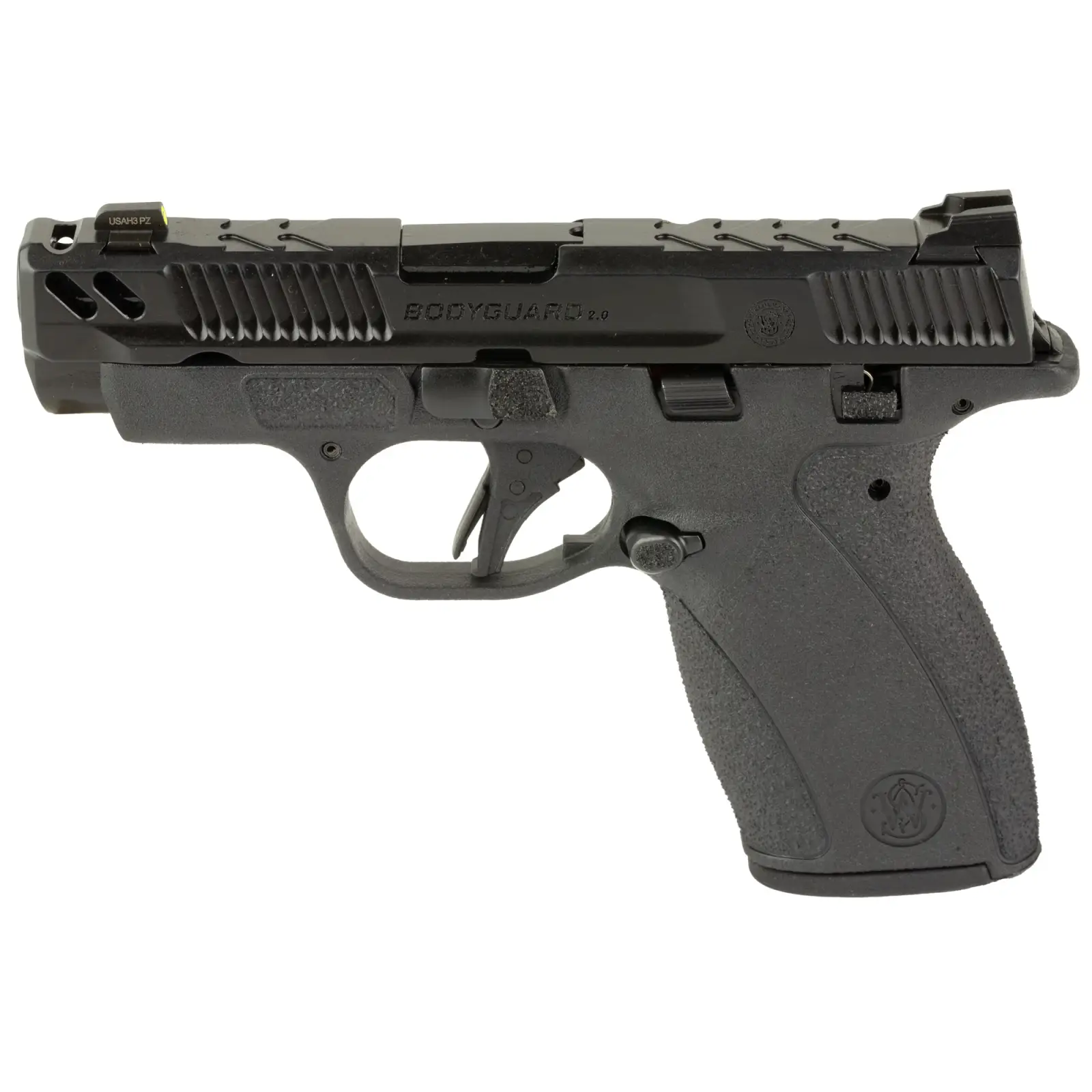 Smith & Wesson, Bodyguard 2.0 Performance Center, Striker Fired, Polymer Frame Pistol, Micro-Compact, 380 ACP, 3.1" Ported Barrel, Armornite Finish, Gray Slide, Black Frame, Ameriglo Protector LumiGreen Front Night Sight, Black Square Notch Ameriglo Protector Rear Sight, Flat Face Trigger, Manual Thumb Safety, 2 Magazines, 10 Rounds