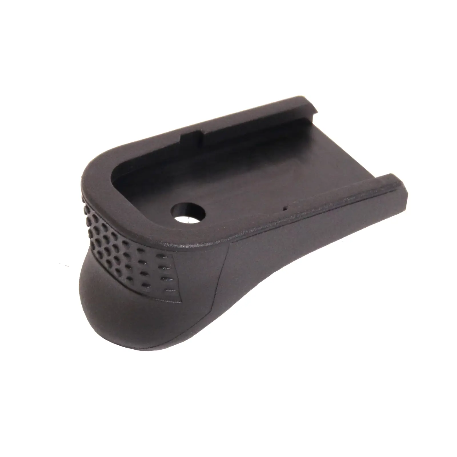 This extension replaces the magazine floor plate adding approximately 3/4" additional length resulting in better control and comfort without altering the capacity of the factory magazine. This extension is slightly longer than the one provided by the factory (actual length 0.820") and incorporates the factory texture pattern as well as an ergonomic curve for better grip.