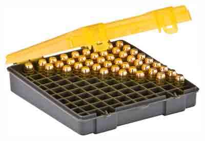 This Plano ammunition field box is designed to hold up to 100 rounds of completed ammunition securely within a hard shell plastic case. This case will ensure your rounds are kept safe when heading to the range or for storage in your gun safe. The flip top lid is semi see through and has 2 snap closures with a locking loop. - Specifications and Features: - Plano Ammunition Field Box 1227-00 - Holds 100 rounds of .40 Smith & Wesson/10mm Auto/.45 ACP - 5.93 x 6.34 x 1.66 - Charcoal/Yellow - 6-Pack