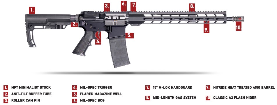 The P-15 BASE Rifle is our feature packed carbine at a price point to please. This 100% American made rifle features POF USA Mil-spec P-15 receiver set and our E2 16.5in match-grade 5.56 NATO barrel. The Mil-spec BCG features our Patented Roller Cam Pin to ensure smooth operation. The Mil-spec Anti-tilt 6 Position Buffer Tube comes standard with a Mission First Tactical Minimalist Retractable Stock. The P-15 receiver set has been Hard Anodized black in color and features a 15in M-LOK Handguard. The BASE rifle gives you a light weight, reliable firearm, that can be upgraded at any time.