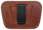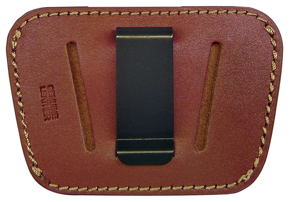 This leather holster has belt slots to fit up to 1.75" belt, with a removeable clip for wearing inside or outside waistband, right or left hand and can be worn in the small of the back. O35 Fits medium to large frame auto handguns such as 9mm and .45 ACP handguns, including 1911.