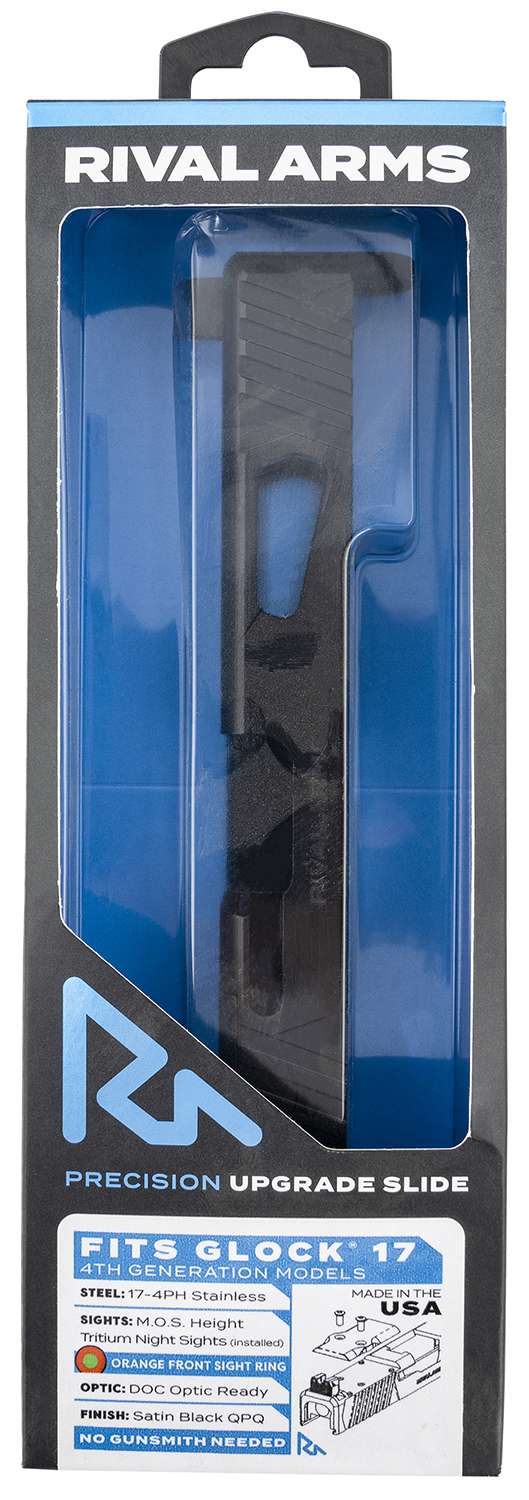 Rival Arms Match Grade Upgrade Slide For Glock 17 Gen 4 MOS, RMR Cut or Other Optics Cut Ready, Fromt and Rear Serrations, Satin Black Quench-Polish-Quench (QPQ) Finish, Tritium 3 Dot Front/Rear Night Sight, Orange Front Sight Ring RA11G105A