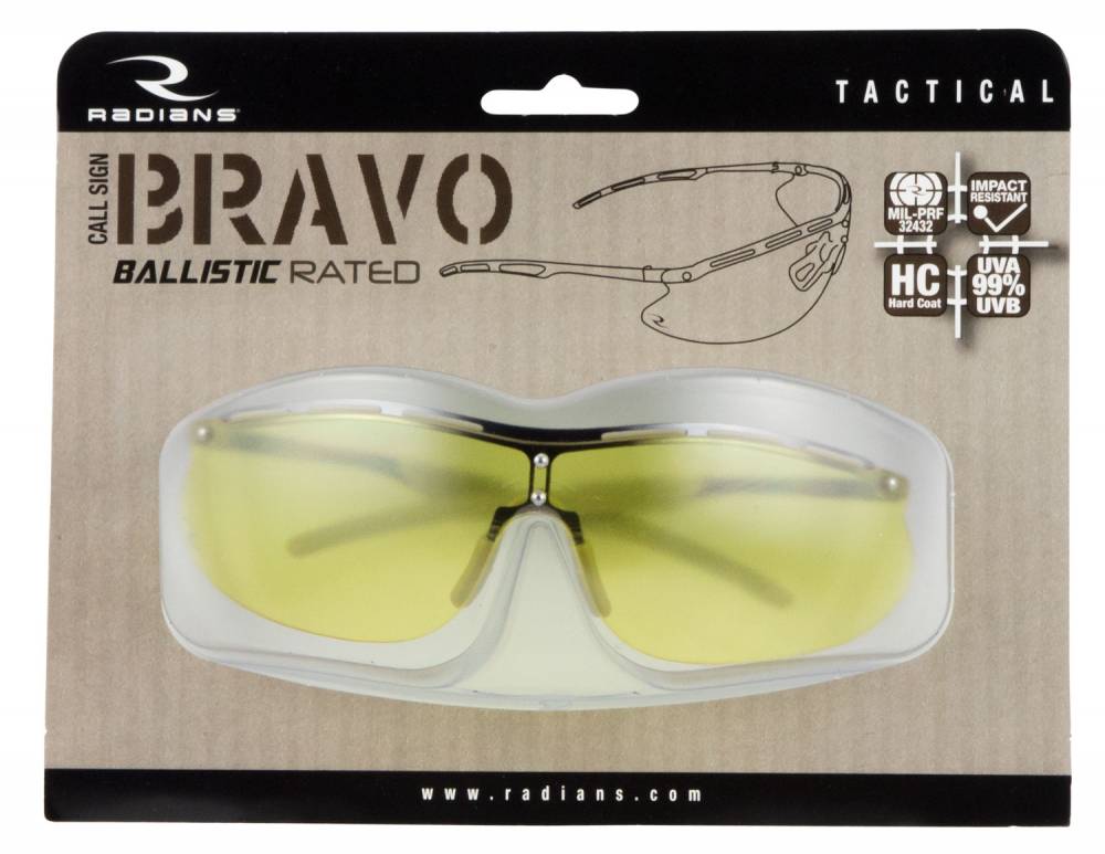 Radians Protective Eyeware features Crossfire's High Definition (HD) Lens Technology which provides enhanced vision while the polarized lens technology prevents glare. Its frame utilizes materials that provides added durability and protection along with TPR technology which increases the grip to keep glasses on your face. The eyeware has polycarbonate lenses with 99.9 percent UV protection, ANSI Z87.1+ standards and a hard coat for scratch resistance. The Bravo glasses is ballistic rated and features a slick low profile frame with rubber tipped temples, dual lens and provides a solid, comfortable fit. It comes with a reusable protective eyewear clam. This model has a metal frame finish with amber lens.
