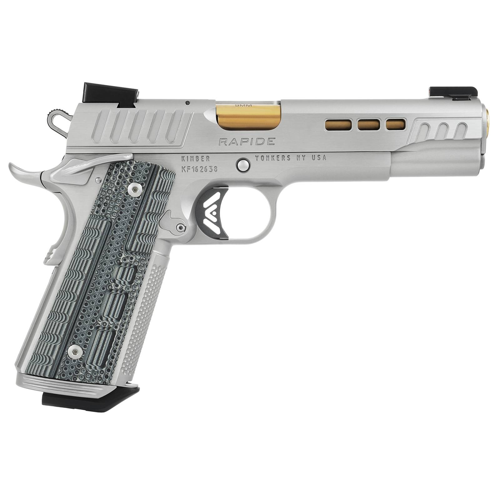 Kimber America, Rapide Dawn, Semi-automatic, 1911, Full Size, 9MM, 5" Barrel, Gold TiN Finish, Brushed Stainless Finish, Silver, TRUGLO TFX Tritium/Fiber-Optic Day/Night Sights, Black/Gray G10 Grips, Manual Safety, 9 Rounds, 1 Magazine, California Compliant