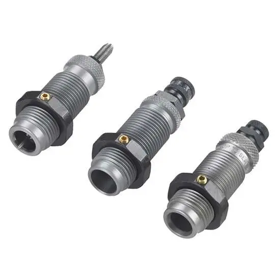 RCBS's 3-Die Carbide Sets is for straight-wall rifle and pistol cases. The Carbide Sizer Die sizes the case and de-primes (the carbide sizer ring eliminates the need to lubricate). Its Expander Die expands the case to the proper diameter to accept the bullet, and it imparts case mouth flare/bell for bullet feeding. The Seater Die seats the bullet and roll crimps.