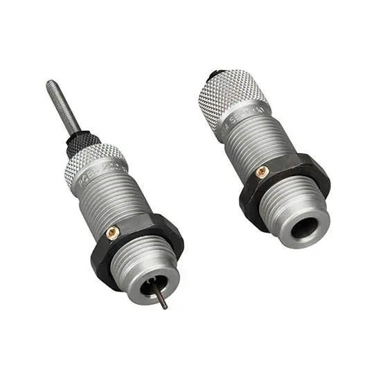 This two-die set is intended for reloading bottleneck cases and consists of a Full-Length Sizer Die with an Expander-Decapping Unit and a Seater Die with Bullet Seater Plug. The Full-Length Sizer Die brings the case to SAAMI minimum cartridge dimensions. It sizes the outside of the case de-primes and expands the neck to accept the bullet. The die has vents to prevent case damage caused by trapped air and for excessive lubricant. Headspace is held to minimum tolerances to avoid changing the case body length during full length sizing. The included Seater Die has a built-in roll crimper to secure the bullet at the same time as it