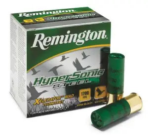 Most ducks are missed from behind, but the unprecedented velocity of Remington HyperSonic Steel compensates for this by reducing required lead by 8 at 40 yards (about a full body length) on a duck flying at average speed. It puts more steel shot in the head and neck for quicker kills and fewer misses. With the highest velocity and downrange pattern energies ever achieved, HyperSonic Steel takes lethality to new heights, to a level of terminal performance where more birds drop with fewer shots at the farthest reaches of your abilities.