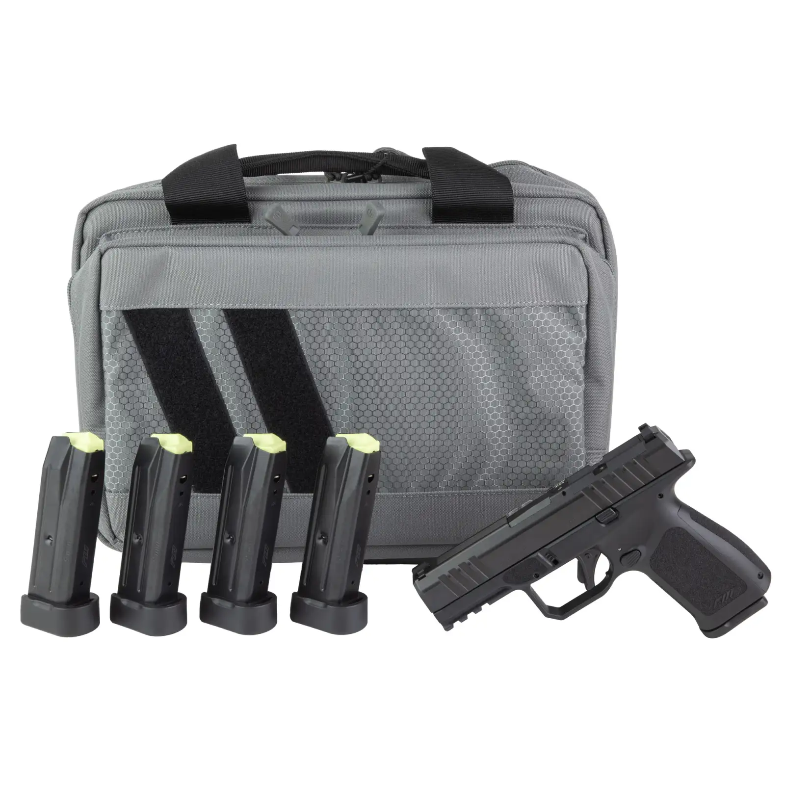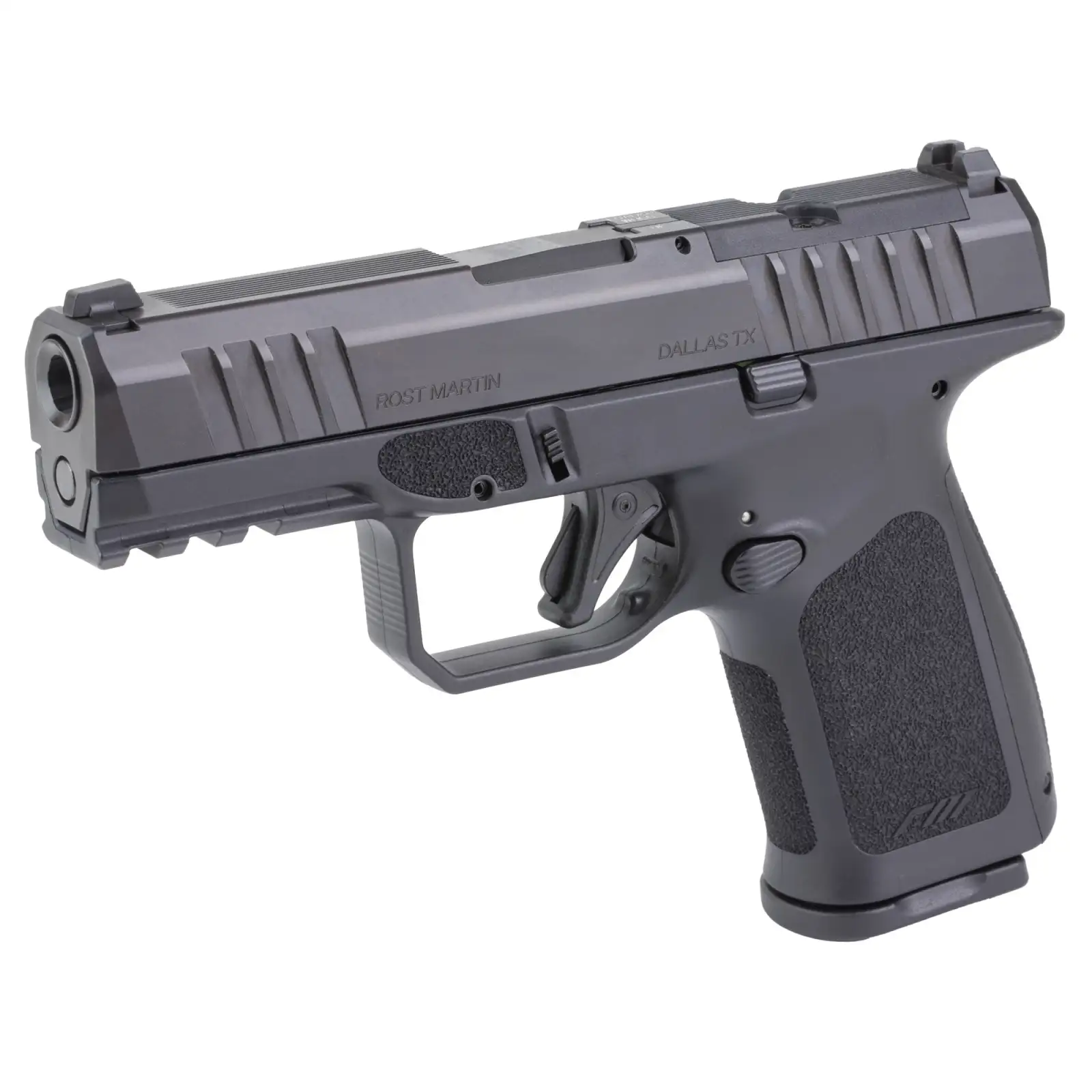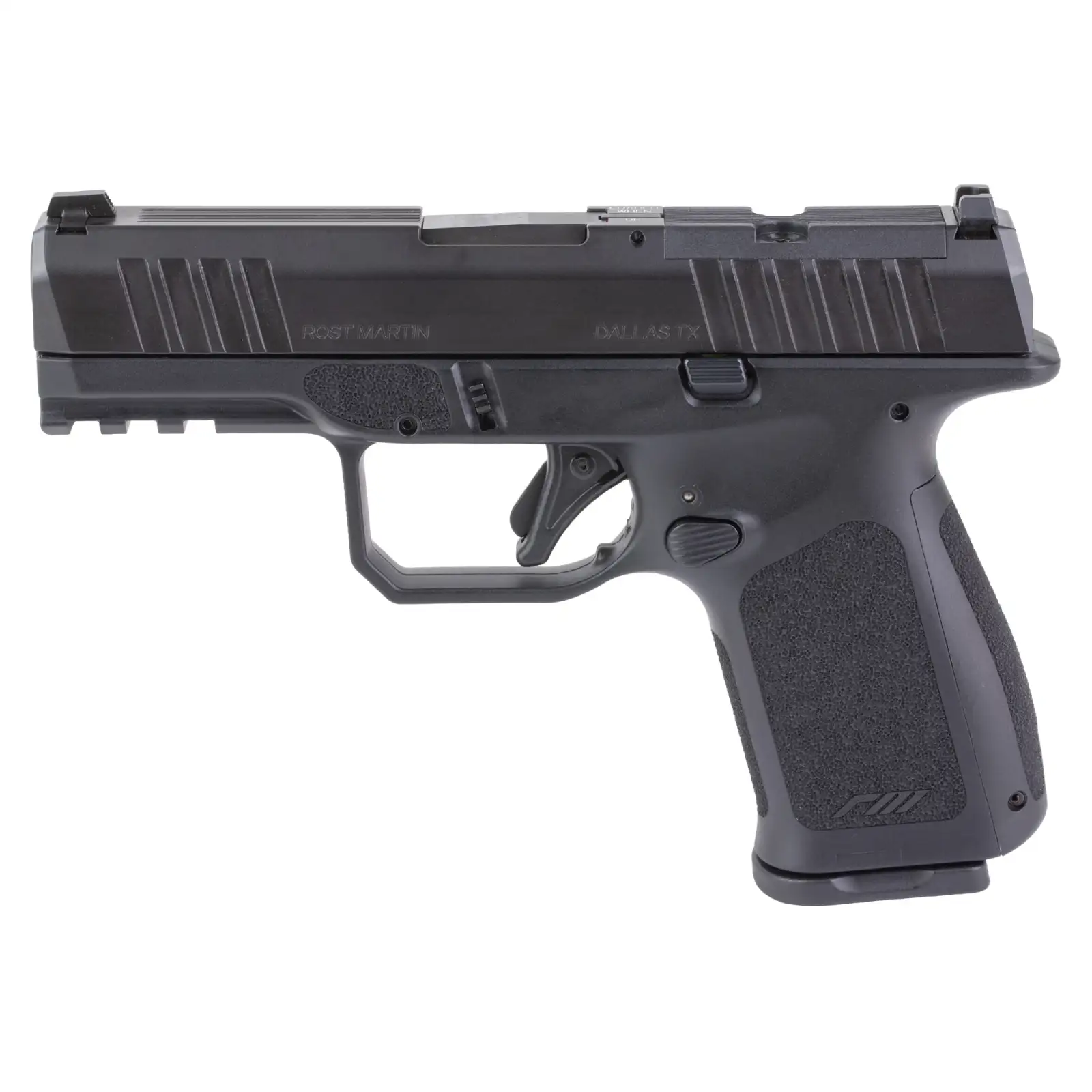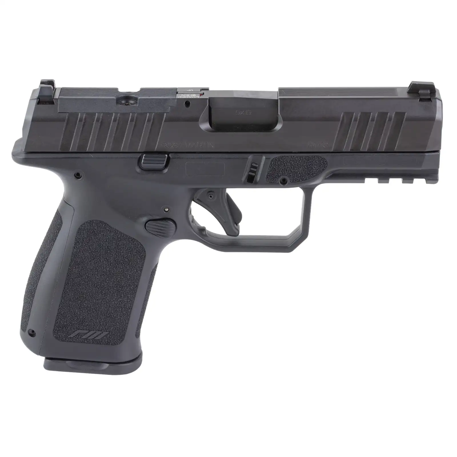 Rost Martin RM1C, Striker Fired, Semi-automatic, Polymer Frame Pistol, Compact, 9MM, 4" Barrel, Nitrocarburized Finish, Black, Front White Dot Sight, Black Serrated Rear Sight, Optics Ready, Ambidextrous, 10 Rounds, Includes RMR Mounting Plate, California Compliant, Savior Specialist Black Pistol Bag, Viridian RFX11 Green Dot Reflex Optic, 1 Flush Mount 10 Round Magazine, 4 Extended 10 Round Magazines RM1CBLKOSP10CA-P