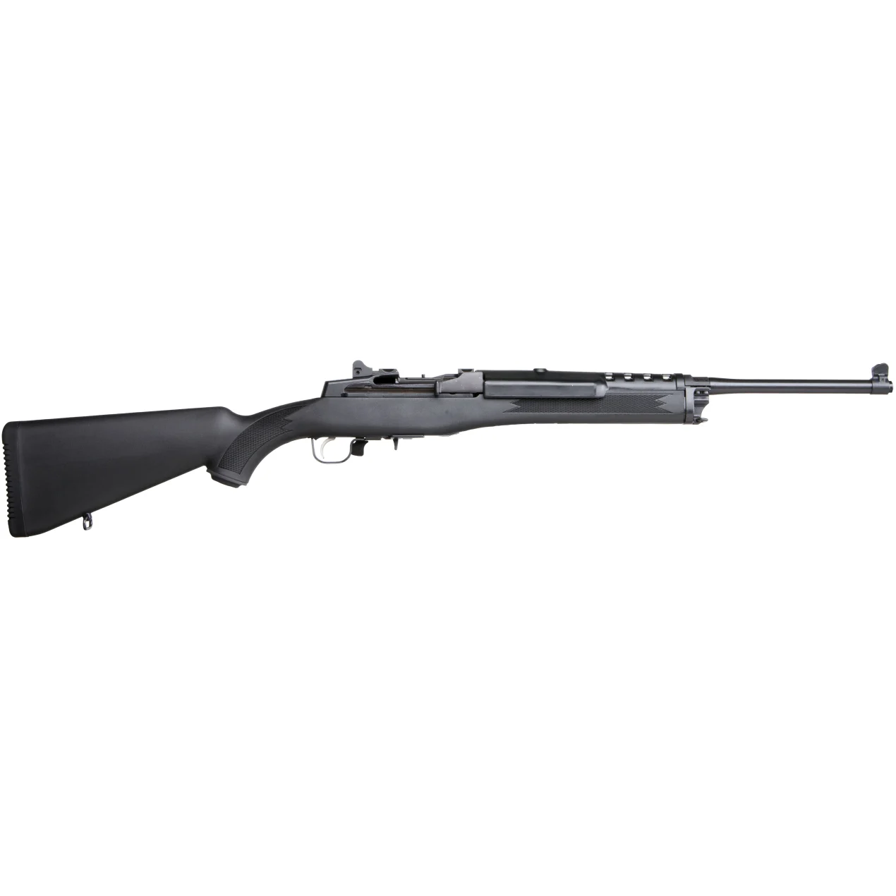 Built with integral scope mounts machined directly into the solid steel receiver, the Mini-30 eliminates scope wobble and provides a stable mounting surface for optics using the included scope rings. The side ejection clears the top-mounted scope, while Ruger's patented integral buffer system protects mounted optics from recoil damage during semi-automatic cycling. Adjustable ghost ring rear sight and protected blade front sight provide excellent backup iron sights, and the receiver is drilled and tapped with an included Picatinny rail for versatile mounting options. Weighing just 6.7 pounds and featuring a durable black synthetic stock, the Mini-30 delivers serious performance in a compact, easy-handling package that's equally at home hunting deer-sized game or defending the homestead.