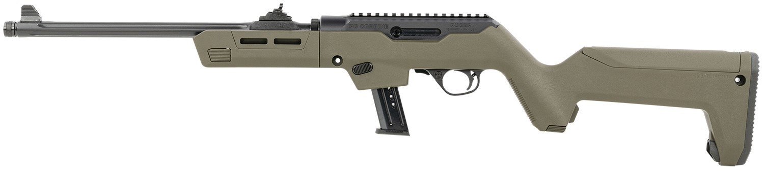 Features a Magpul PC Backpacker stock with an ergonomic handguard, optional QD sling mounting capability, integrated storage compartment in the grip, a hinged storage compartment in the stock capable of storing spare magazine, an MOE SL non-slip rubber buttpad, and a unique locking interface to attach the barrel assembly to the receiver when being transported. The Ruger PC Carbine features an integrated Picatinny-style rail. Features a threaded barrel with included thread protector that allows for use of standard muzzle accessories; interchangeable magazine wells for use of common Ruger and Glock magazines. Ships with SR-Series pistol magazine well installed and an additional magazine well accepting Glock magazines is included; accurate sighting system with adjustable ghost ring rear aperture sight and non-glare, protected blade front sight; Soft rubber buttpad with spacers allows the rifle to be properly sized for different shooters or varying levels of outerwear or defensive gear; durable glass-filled nylon synthetic buttstock features a proprietary texture for enhanced control and an integral sling mount for rapid sling attachment; light, crisp trigger pull with minimal overtravel and positive reset utilizing proven 10/22 trigger components and the heavy contour barrel provides consistent accuracy, while barrel fluting sheds unnecessary weight and allows for quick handling.
