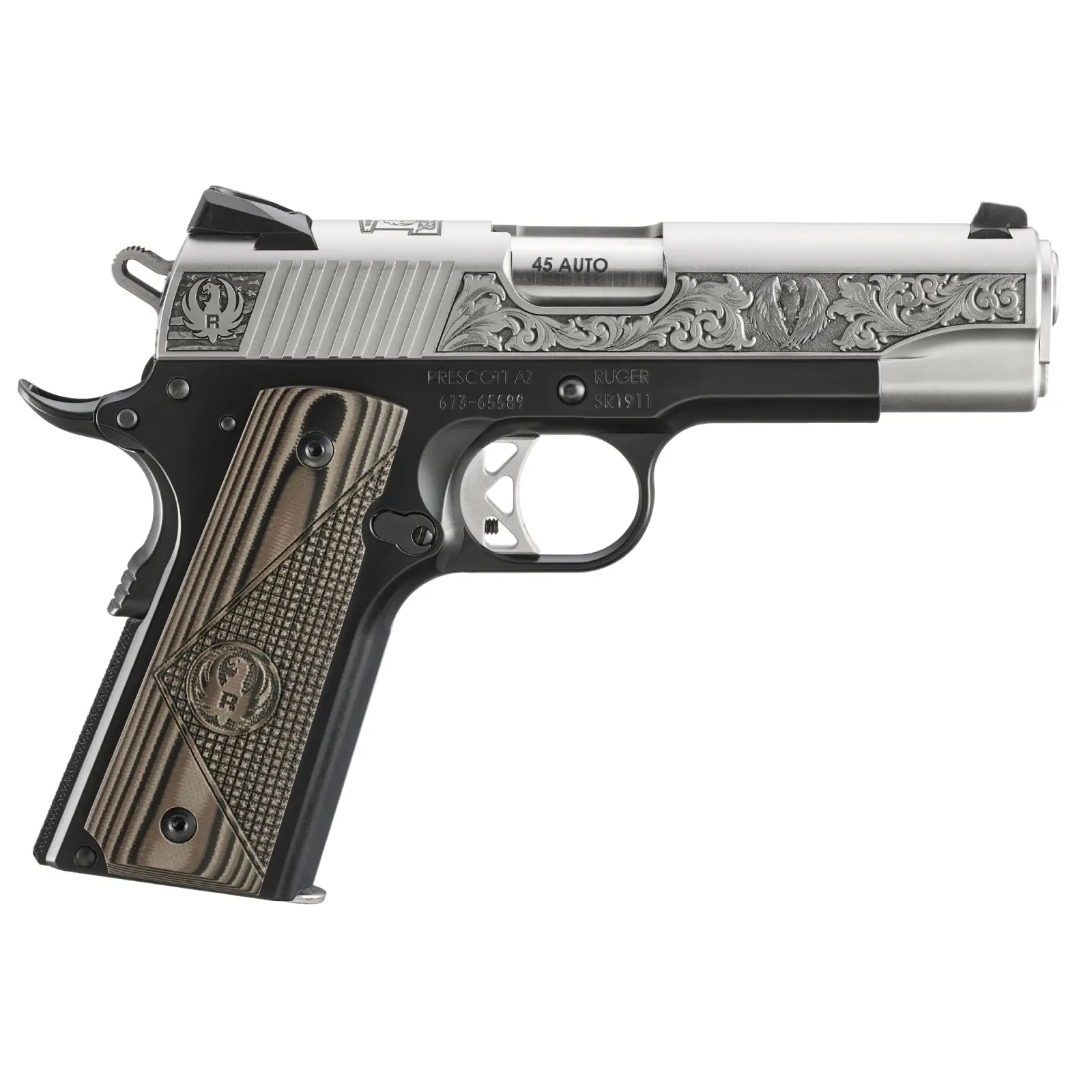 Ruger, SR1911, Prescott AZ Edition, Semi-automatic, Metal Frame Pistol, 45 ACP, 4.25" Barrel, Aluminum Frame, Anodized Frame and Low-Glare Stainless Slide, Black Frame with Engraved Silver Slide, Brown/Black G10 Grips, Drift Adjustable Novak 3 Dot Sights, 7 Rounds, 2 Magazines