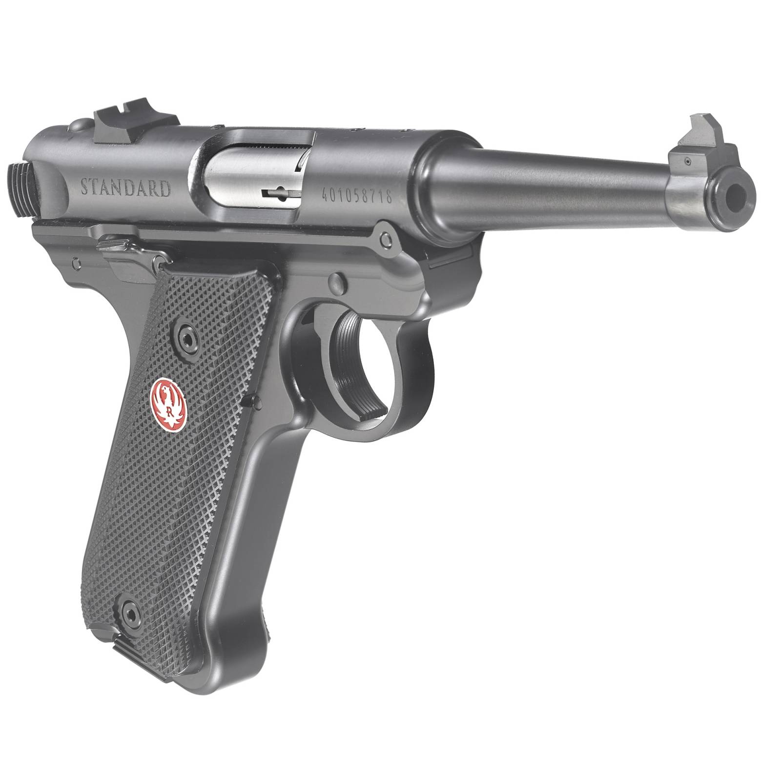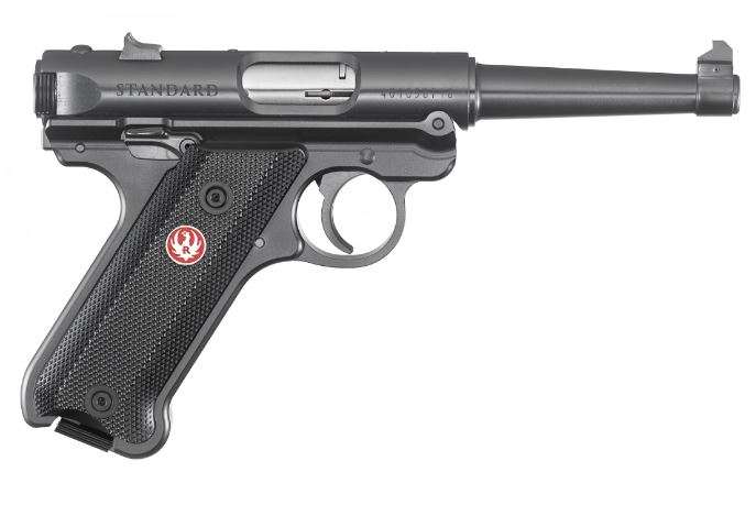 Ruger, Mark IV, Standard, Single Action, Semi-automatic, Metal Frame Pistol, Full Size, 22LR, 4.75" Barrel, Alloy, Blued Finish, Checkered Grips, Fixed Sights, 10 Rounds, 2 Magazines