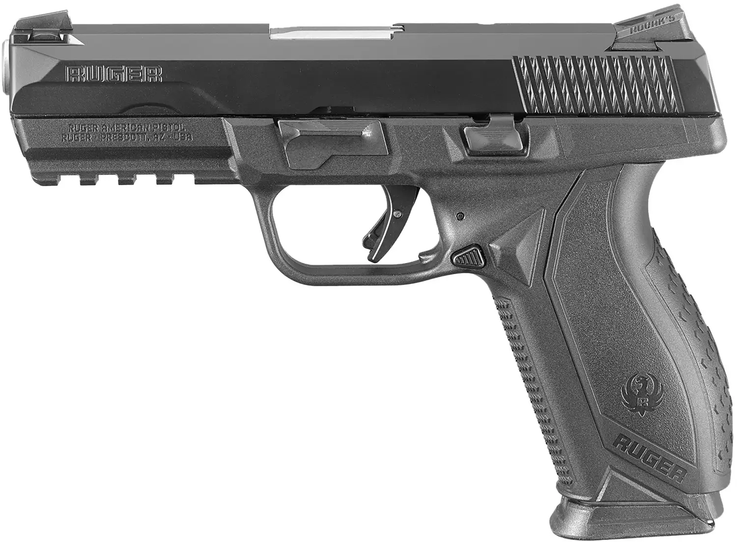 The Ruger American Pistol. Anything else would be Un-American. They are designed with the toughest standards in mind and built to perform in the harshest conditions. The Ruger American combines a recoil-reducing barrel cam (which better spreads recoil over time) with a low mass slide, low center of gravity and a low bore axis to provide better balance, less felt recoil and less muzzle flip than comparable pistols. The American pistol also features a pre-tensioned striker system, which allows for a short take-up trigger with positive reset, and a modular wrap-around grip system that adjusts palm swell and trigger reach to fit a wide range of hand sizes. The Ruger American Pistol is built on a rigid, one-piece, precision-machined, black nitride, stainless steel chassis with integral frame rails and fire control housing. Additional features include genuine Novak LoMount Carry three-dot sights, a stainless steel slide with non-reflective, black nitride finish, a one-piece, high-performance, glass-filled nylon grip frame and a mil-standard 1913 accessory rail. Safety features include internal, automatic sear block system, ambidextrous manual safety, integrated trigger safety and no trigger pull required for takedown. Pro Models come without manual safety. Includes two 17-round magazines.