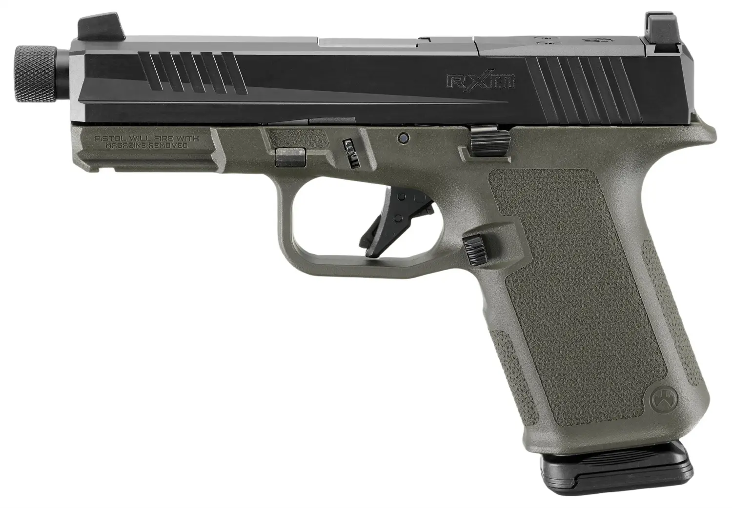 The Ruger RXM features an interchangeable Magpul enhanced grip; most major components are designed for Gen3 compatibility with off the shelf parts, holsters and accessories; Co-witness-height steel sights feature a tritium night front sight; low-profile, flared magazine well; magazine release scalloped for easy access; universal accessory rail for use with a variety of lights and lasers; threaded barrel w/thread protector; extended magazine release and raised slide stop. Slide allows for direct optic mounting of RMR, DPP and RMSc pattern optics. Includes two Magpul PMAG 15rd GL9 magazines and a co-branded plastic carry case.