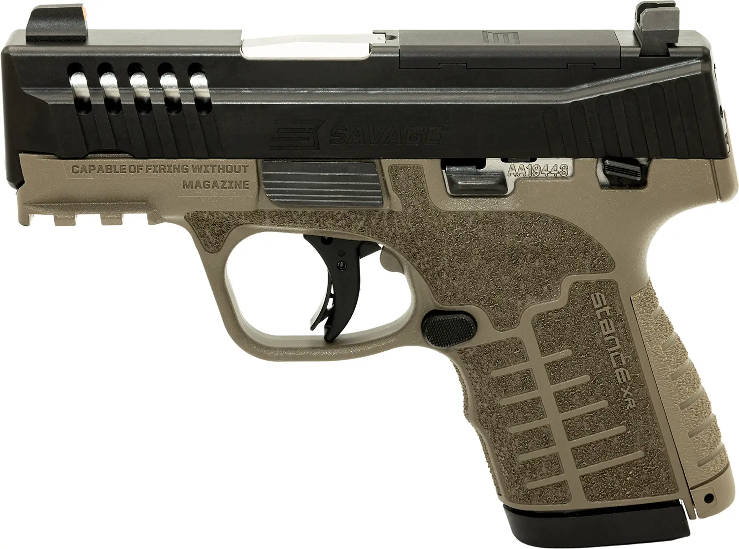 The Savage Stance XR Night Sights refines the micro pistol into a thin, easily concealable firearm that is built to be both functional in the hand as it is easy to conceal. With its aggressive surface textures, advanced slide serrations and ergonomic grip, Stance XR is designed to be comfortable when holstered and formidable when it needs to be. The Quick Release Optics (QRO) plate makes installing and removing optics simple and quick. Includes hard case, two interchangeable backstraps, one 10rd and one 13rd extended magazine.