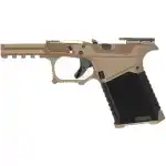 Frame assembly includes: SCT19polymer frame, electroless nickel locking block, polished trigger assembly with electroless nickel trigger bar and polymer trigger, standard polymer magazine catch, magazine catch spring, steel trigger pin, steel locking block pin, standard slide lock, slide lock coil spring, polymer trigger housing pin, trigger housing with GEN4 style ejector, standard slide stop assembly & polished 5.5 lb. electroless nickel trigger connector.