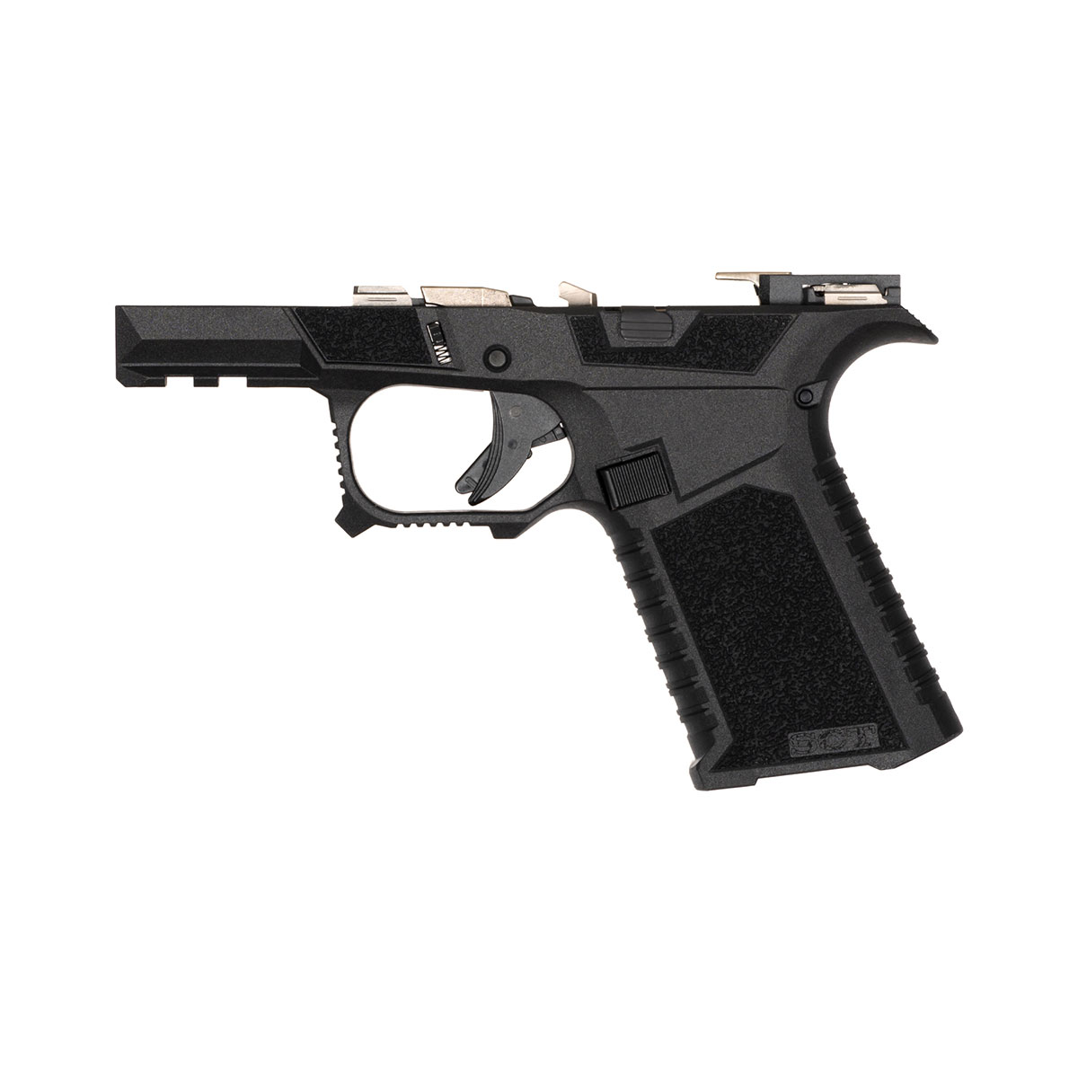 Frame assembly includes: SCT SC polymer frame, electroless nickel locking block, OEM trigger assembly, standard polymer magazine catch, magazine catch spring, steel trigger pin, steel locking block pin, standard OEM slide lock, slide lock coil spring, polymer trigger housing pin, OEM trigger housing with ejector, standard slide stop assembly & polished 4.5 lb. electroless nickel trigger connector.