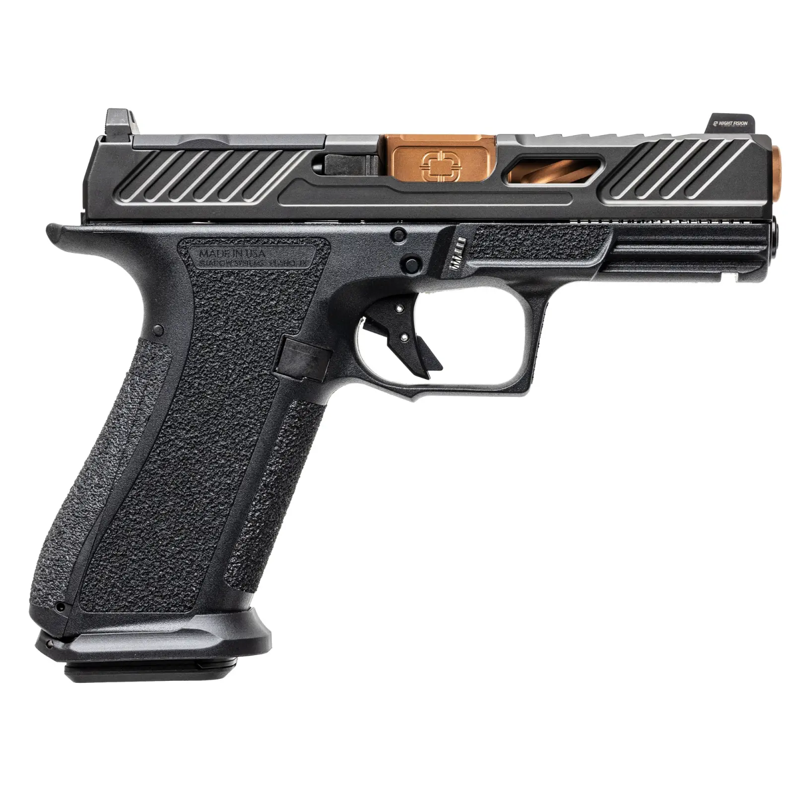Shadow Systems, XR920 Elite, Striker Fired, Semi-automatic Pistol, Full Size, 9mm, 4" Bronze Spiral Fluted Barrel, Unthreaded, Polymer Frame, Nitride Finish, Black, Front Night Sight, Trigger Safety, 10 Rounds, Includes 2 Magazines, California Compliant