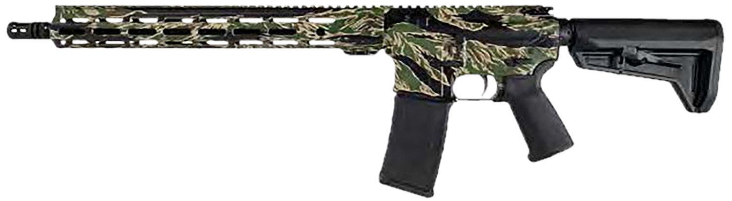 The Tiger Stripe AR takes camouflage to the next level with a bold, eye-catching design. Featuring a high-quality tiger stripe camo hydro-dipped finish on both the receivers and handguard, this rifle combines tactical functionality with a fierce, dynamic look. Perfect for those who want their rifle to stand out in both form and function, the Tiger Stripe AR offers a striking, durable finish that blends performance with a unique, aggressive aesthetic.