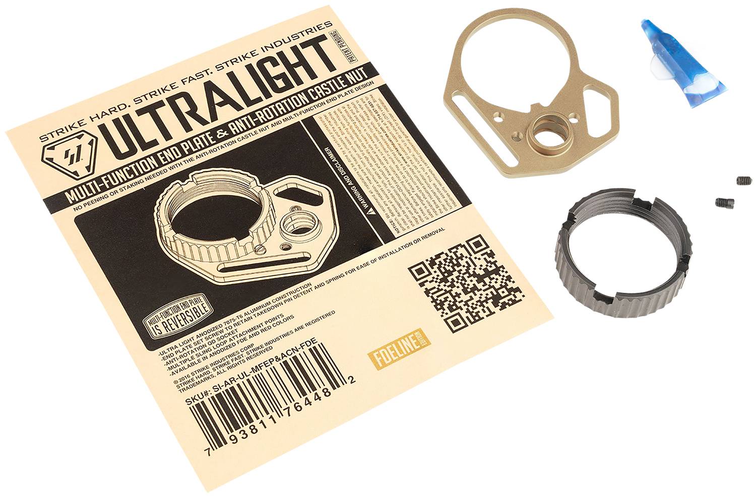 The SI Multi-Function End Plate and Anti-Rotation Castle Nut are designed to update and upgrade the often neglected castle nut and endplate system. While the traditional endplate and castle nut works extremely well in retaining your receiver extension, the peening of the castle nut is not conducive to rebuilding. With the vast amount of aftermarket support for the AR system today, we felt that there's a need for a secure system as adaptive as you are. Enter the MFEP and ACN. The MFEP and ACN offer an anti-rotate QD socket or sling loops built in. The Anti-Rotation Castle Nut is specifically designed to work with this end plate. Instead of peening the endplate to secure the castle nut, a set screw fulfills this function to allow for multiple uses as you upgrade, or update your build. The Multi-Function End Plate is reversible, and has three integral sling mounting options. A traditional sling loop, a loop for hook style attachments, and a QD socket gives you the flexibility in using whichever attachment you prefer.