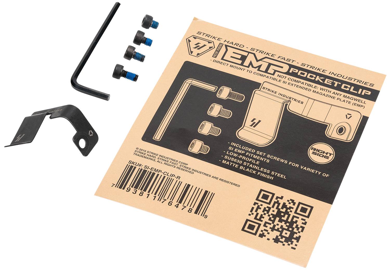 The Strike Industries EMP Pocket Clip gives you a quick and easy way to carry a spare pistol magazine for when you need it. As well as the clip can help hang or organize magazines in a range bag or safe. Offered for either right or left handed shooters, also however you prefer your bullet facing orientation, this SUS630 stainless steel matte black finish low-profile pocket clip is made to only work with compatible Strike Industries Extended Magazine Plates (EMP). This pocket clip attaches directly to compatible SI EMP's to ensure a fast draw with no fuss.
