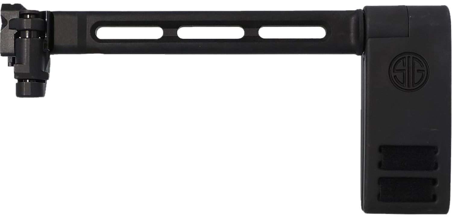 Sig Sauer MCX/MPX Folding Pivoting Contour Brace. This folding firearm brace is constructed of high-quality aluminum with a steel foldable attachment knuckle. With the appropriate adapter, this genuine Sig Sauer accessory easily installs onto the rear end of the Sig MCX or MPX platform firearm chambered in any caliber including .223 Rem, .308 Win or .300 Blackout. The brace provides a solid stabilization to improve accuracy through the use of the adjustable nylon strap located on the pivoting clamp style polymer brace. Installed on the rear adapter via a 1913 standardized clamp, the stock / brace does not impede normal operation of the firearm when folded. This brace is made to the same high standards as the parts already found in your Sig Sauer firearm. Genuine Sig Sauer accessories are designed around the same relentless standards put into every pistol and rifle Sig makes. Kit up, dress up or service your Sig Sauer with original quality parts and accessories.
