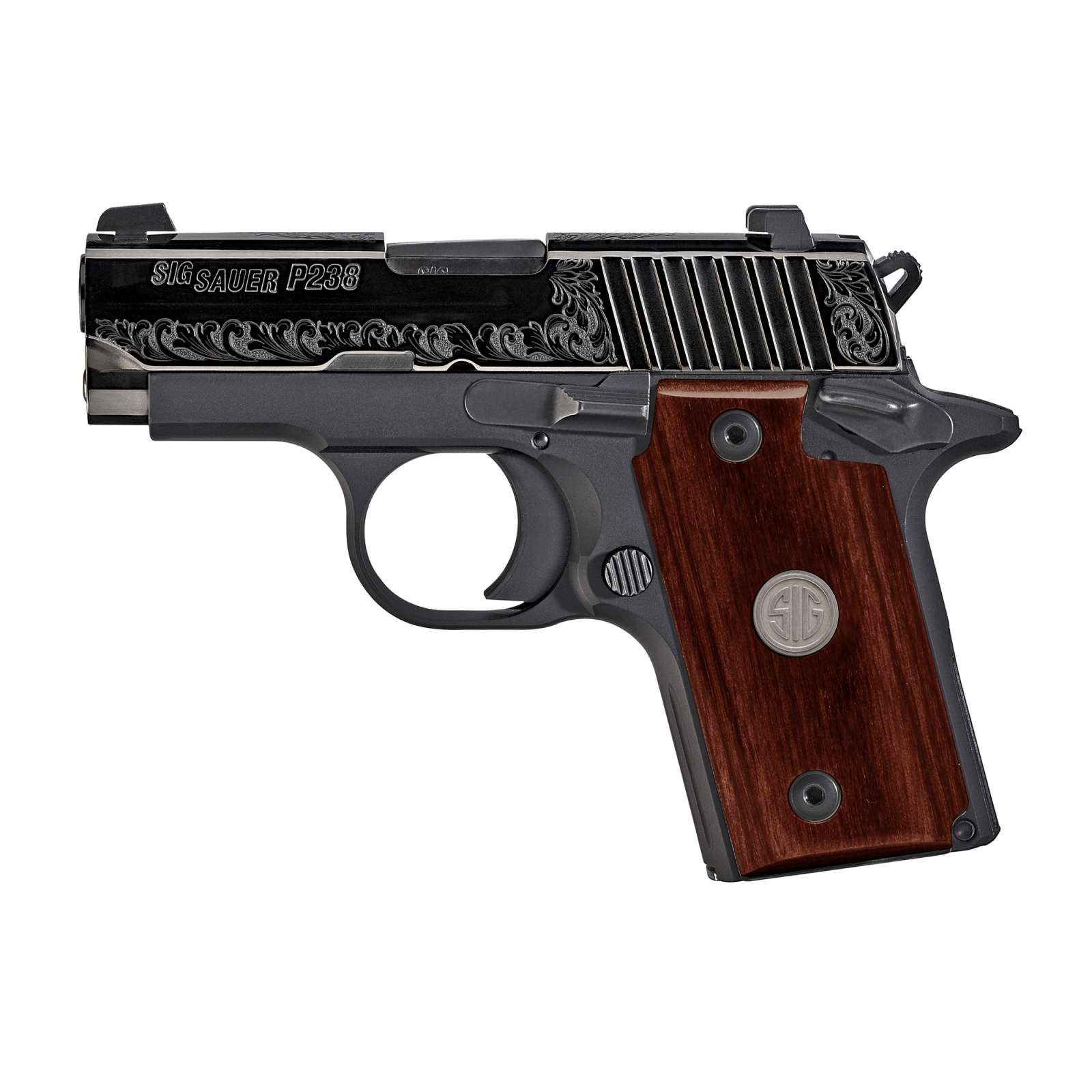 Sig Sauer P238 Engraved Slide, Micro-Compact, 380ACP, 2.7" Barrel, Alloy Frame, Black Finish, Rosewood Grips, SIGLITE Night Sights, 6Rd, Engraved Polished Nitron Slide 238-380-ESR