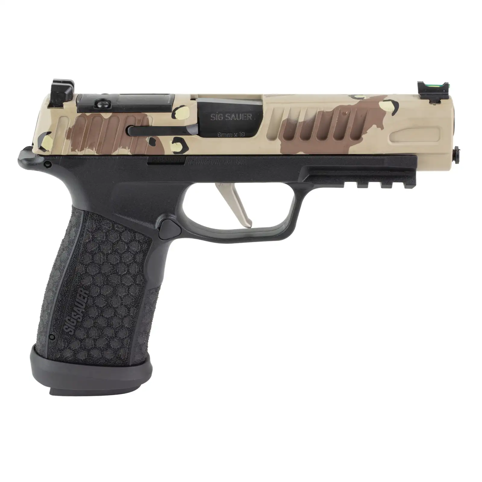 Sig Sauer P365 Fuse, Semi-automatic, Polymer Frame Pistol, Compact, 9MM, 4.3" Barrel, Cerakote Finish, Chocolate Chip DS Camo by Skydas, Sig Sauer LXG Grip, Fiber Optic Front and Low Profile Combat Rear Sights, 3 Magazines, (2)-21 Round Magazines and (1)-17 Round Magazine 365XF9BFO-DSCAMOSKY