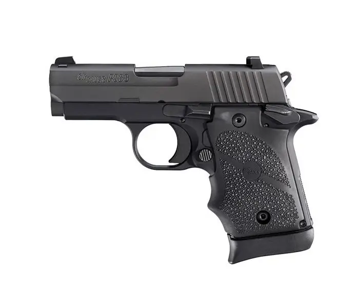 The P938's construction showcases a durable alloy frame finished in Nitron black, providing both strength and a sleek, understated appearance. The black rubber grips are designed for comfort and improved handling, ensuring a secure and comfortable grip even during extended shooting sessions. These grips also help in managing recoil, making the pistol easier to control for rapid, accurate follow-up shots.
