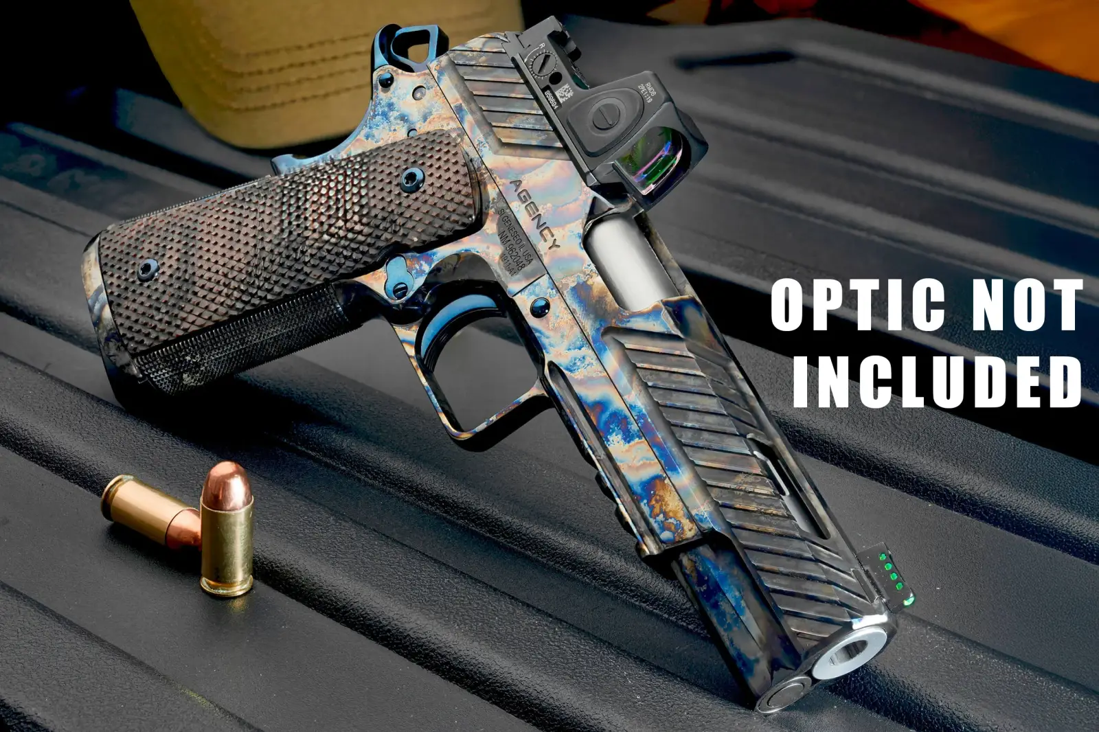 Each have been cut to include any Agency Arms AOS (Agency Optic System) for red dot mounting plate. Each include the AOS optic plate for the RMR/SRO A14B (pictured RMR is not included). Each include an optic plate cover for those that like to run irons. Tuned spring weights, new polished controls, vibrant blue nitre controls, and Color Cased on a high polished frame and slide. A firearm you can spend hours admiring and will be ideal for your holster.