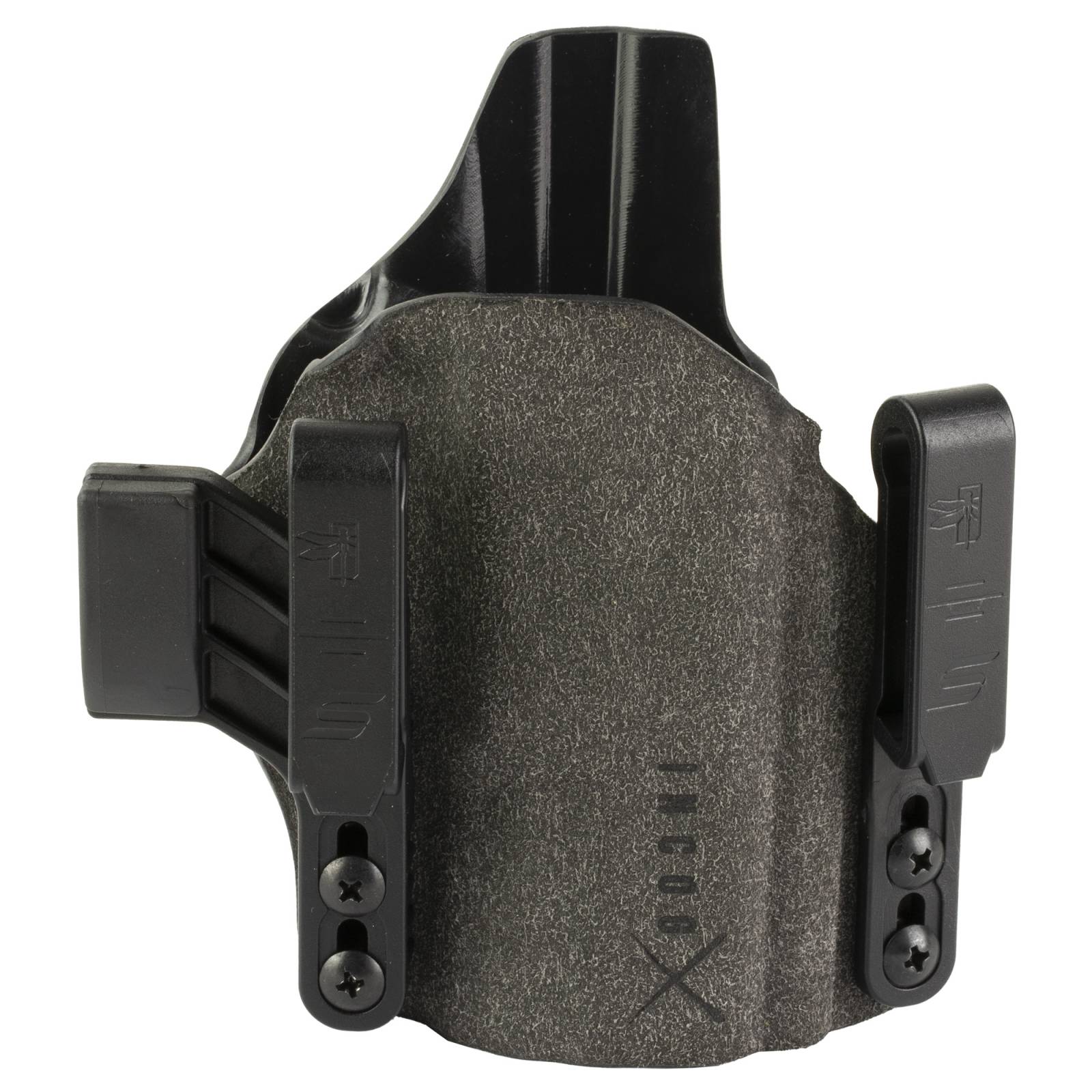 The Incog X is compatible with any Red Dot Sight (RDS) capable of being installed on the firearm manufacturer's slide behind the ejection port (including mounting options using the firearm manufacturer's adapter plates). They tested dozens of popular RDS models including larger optics like the Trijicon SRO. The Trijicon SRO requires a slight repositioning of the upper flat clip to eliminate minor interference, but works flawlessly after adjustment. Boltaron construction provides form fitting passive retention. Suede exterior adds extra friction for secure IWB wear. Adjustable clip positioning allows for ride-height adjustment.