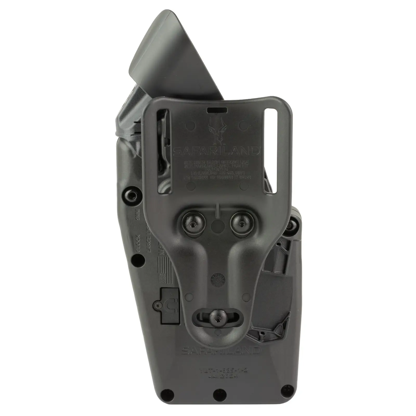 SafariVault - The strongest holster body Safariland has ever built. Its increased structural integrity withstands higher forces and impacts from any direction. SafariVault's improved ALS design reduces flex and increases crush resistance. The all-new self-clearing optic cover accommodates closed and open emitter pistol optics, while a magnetic holstering guidance system stabilizes the slide while holstering. The intuitive design speeds up time to target and ease of reholstering. SafariVault's open muzzle design provides clearance for threaded barrels or compensators and allows debris or brass to pass through.
