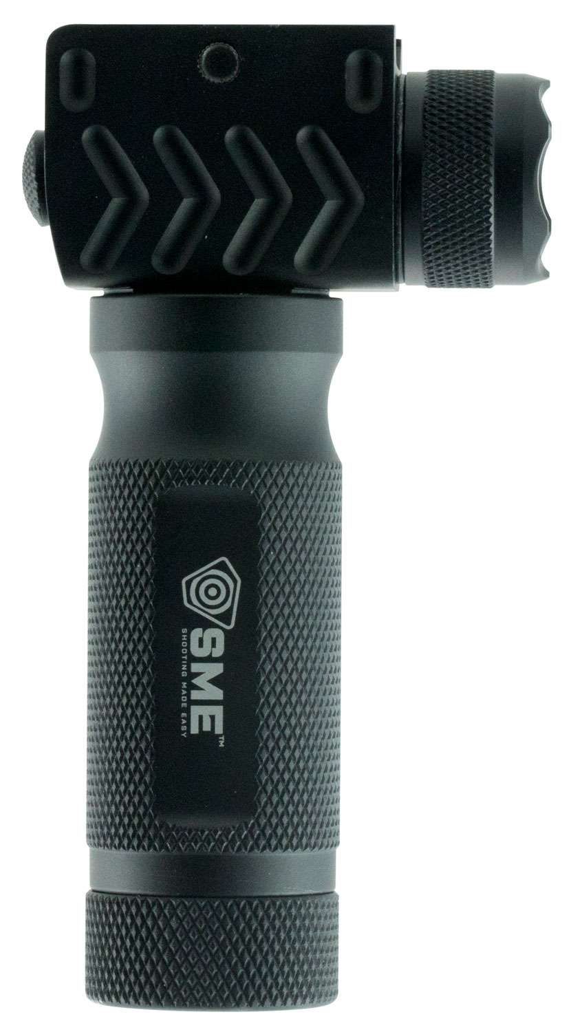 SME's Vertical Fore Grip Weapon Light is a powerful 260 lumen CREE LED flashlight, with constant on and blinding strobe modes. It is made of a water resistant, durable aircraft grade 6061-T6 aluminum with a quick crossbar mounting system and wingnut which allows installation and removal of the grip to any Picatinny or Weaver rails. The weapon light utilizes a spot focus for clear and precision target identification, two CR123 battery, and has a 3.9" grip length. This model has a black finish.
