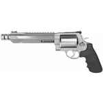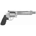 Smith & Wesson's Model 460XVR (X-treme Velocity Revolver) has the highest muzzle velocity of any production revolver on earth. The Performance Center firearm is the ultimate expression of old-world craftsmanship blended with modern technology. This model has a stainless steel frame, barrel, and cylinder (without fluting). It has also fiber optic front sight, adjustable rear sight, chrome teardrop hammer, chrome trigger with trigger stop, and PC Tuned Action. This model has a muzzle brake and a integral scope base.