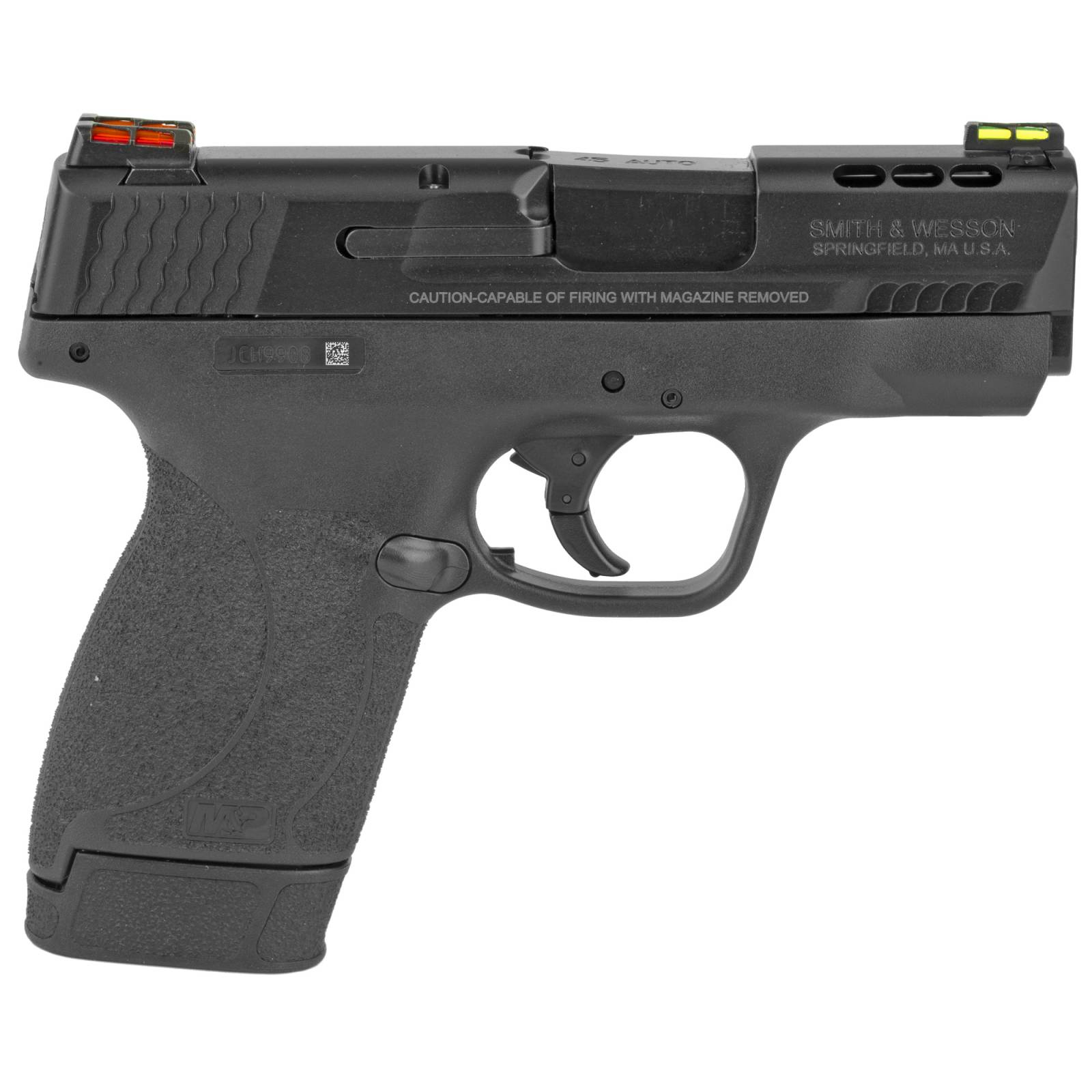 Smith & Wesson, Shield M2.0, Performance Center, Semi-automatic, Striker Fired, Micro-Compact, 45 ACP, 3.3" Ported Barrel, Armornite Finish, Black, HiViz Fiber Optic Sights, No Thumb Safety, 2 Magazines, (1) 6-Round and (1) 7-Round, Performance Center Tuned Action, Cleaning Kit