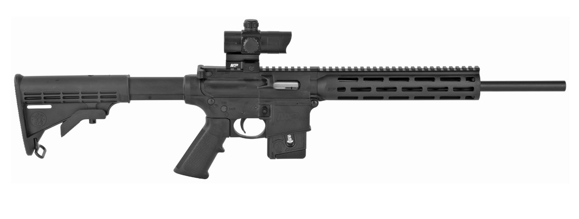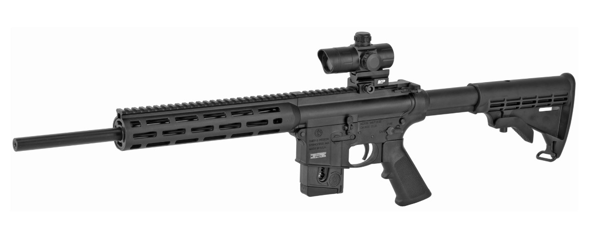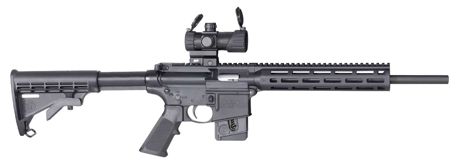 It comes with the Magpul MBUS front and rear sights but has a long Picatinny rail ready for red dots or optics. The M&P15-22 still offers features such as a full charging handle, a 6-position stock, and a 2-position safety, and it is CA Compliant. It has an M&P Red/Green dot optic and a 10-round magazine.