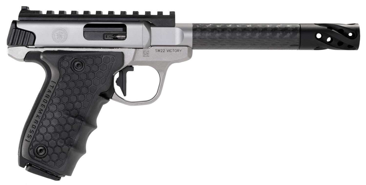 Smith & Wesson, SW22 Victory, Target, Performance Center, Single Action Only, Semi-Automatic, Metal Frame Pistol, Full Size, 22LR, 6" Target Carbon Fiber Barrel, Muzzle Brake, Stainless Steel, Glass Bead Finish, Tandemkross "hiveGrips" with Target Thumbrest Grip, Manual Thumb Safety, 10 Rounds, Optics Ready, 2 Magazines