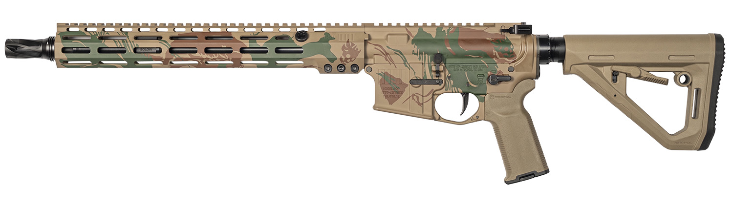 The OB1 Rifle from Christian Craighead features Christian's Signature take of Rhodesian camouflage. Features a 13.75" L89 rail; forged upper and lower receivers; L2S two stage trigger; Magpul DT stock; K2+ grip, and has the Blackbeard Boarding Party logo deeply engraved over the magazine well. Includes magazine.