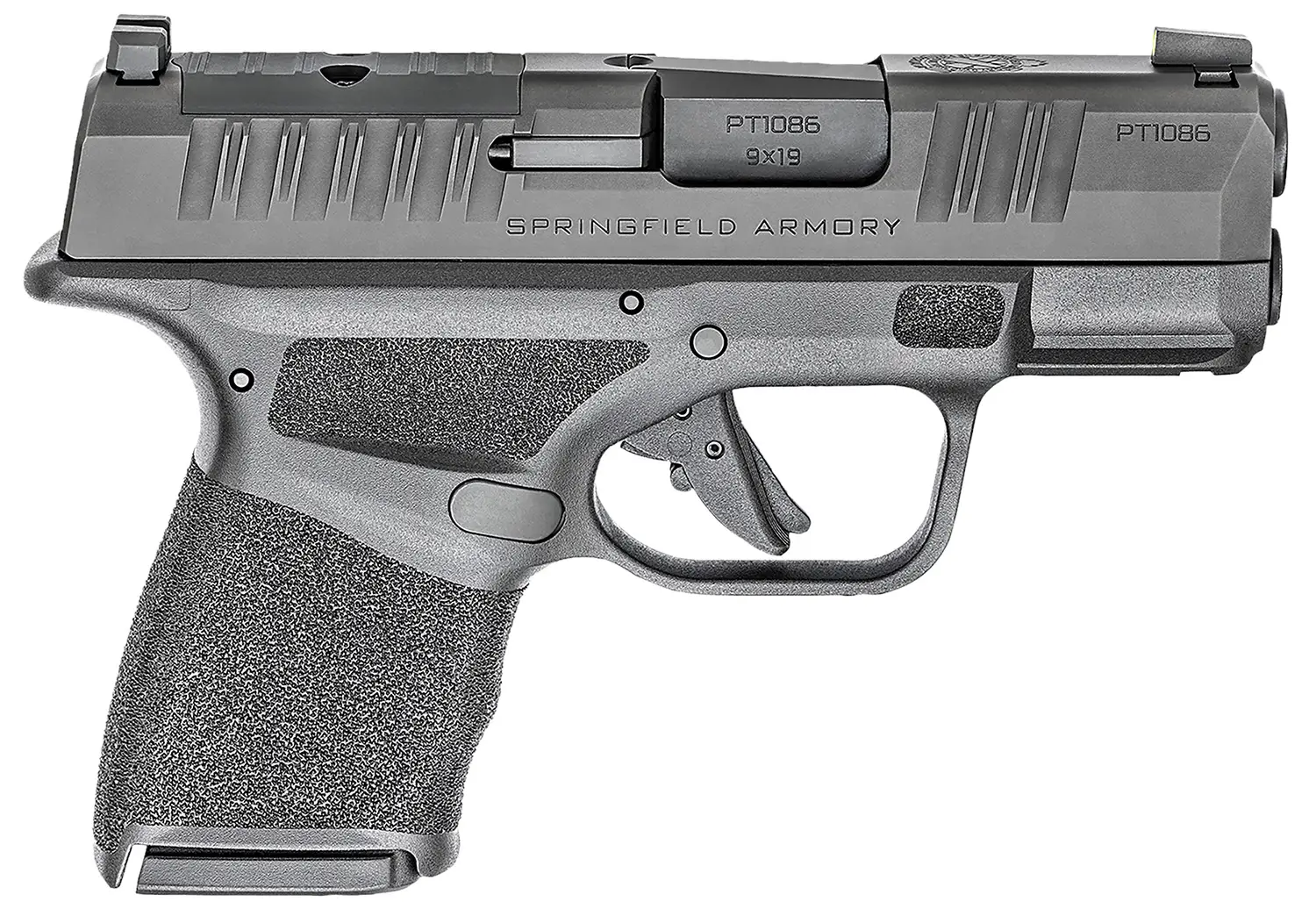 Springfield Armory micro-compact Hellcat features unique top slide serrations to maximize your grip on the slide; rear slide deck is cut to accept a micro red dot; non-proprietary accessory rail allows you to accessories with your favorite light and/or laser; Tritium/Luminescent front sight, Tactical Rack U-Notch rear sight; reversible mag release, loaded chamber indicator and custom pressure activated grip texture. Includes Viridian RFX-11 Green Dot Optic, 5 10rd Magazines and Dual range bag.