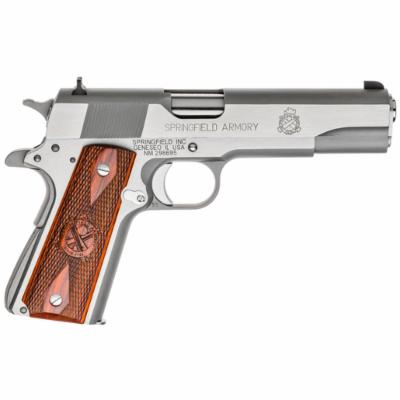 The 1911 Mil-Spec is built on a full-size frame and slide with a match grade, forged stainless steel 5" barrel. Its slide features rear slanted serrations. The mainspring housing is the original arched style found on GI issue 1911-A1s, but it includes the Springfield Armory I.L.S. Each Mil-Spec comes with a beautiful pair of cross-cannon emblazoned Cocobolo grips held in place with slotted grip screws.