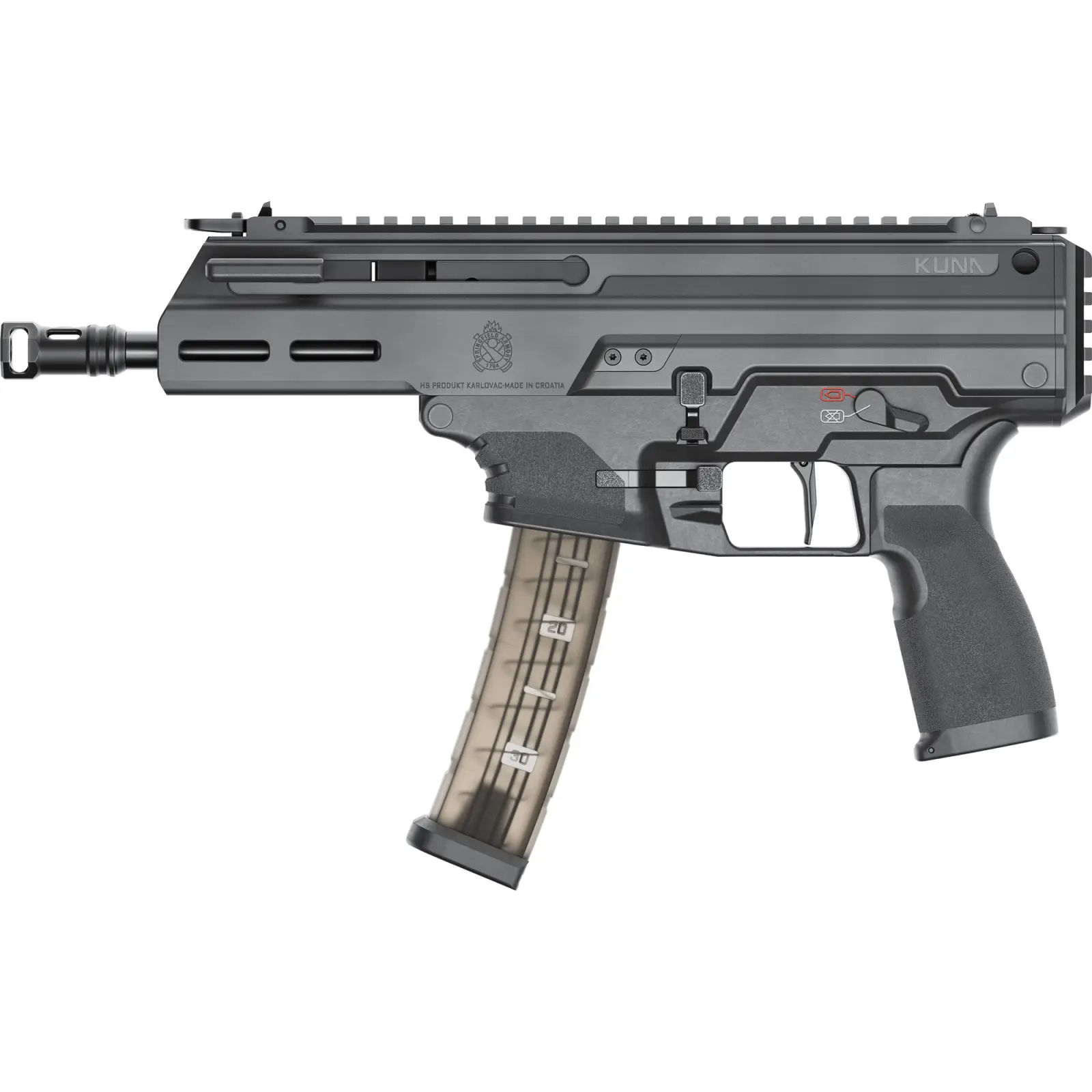 Designed to deliver exceptional shooting stability in a portable package, the Kuna houses a roller-delay operating system that dramatically reduces felt recoil and enhances control. Chambered in 9mm, it features a 6" threaded barrel with a muzzle brake, hybrid flip-up sights, and a 30-round translucent magazine with metal feed lips for reliable operation. Fully ambidextrous controls ensure seamless engagement for any shooter, while the non-reciprocating charging handle keeps handling smooth and unobstructed. The integrated Picatinny rail end plate allows easy attachment of stabilizing braces for added support.