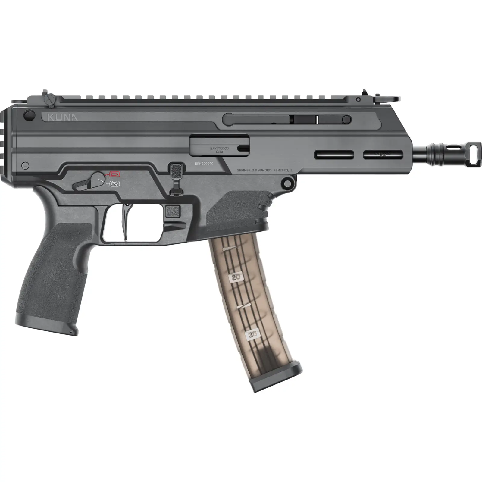 Springfield, Kuna, Semi-automatic Pistol, 9MM, 6" Threaded Barrel, 1/2x28 Thread Pitch, Roller Delayed, MLOK Handguard, Picatinny Receiver End Plate, Anodized Finish, Black, 30 Rounds, 2 Magazines, Includes Front and Rear Flip Up Sights
