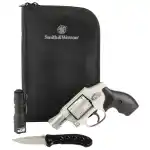 Smith & Wesson, Model 642, Double Action Only, Metal Frame Revolver, J-Frame, 38 Special +P, 1.88" Barrel, Aluminum Alloy, Matte Finish, Silver, Rubber Grip, Fixed Sights, 5 Rounds, No Internal Lock, Bundle Comes With S&W Branded Discreet Portfolio, M&P Delta Force Flashlight, S&W Oasis Liner Lock Folding Knife